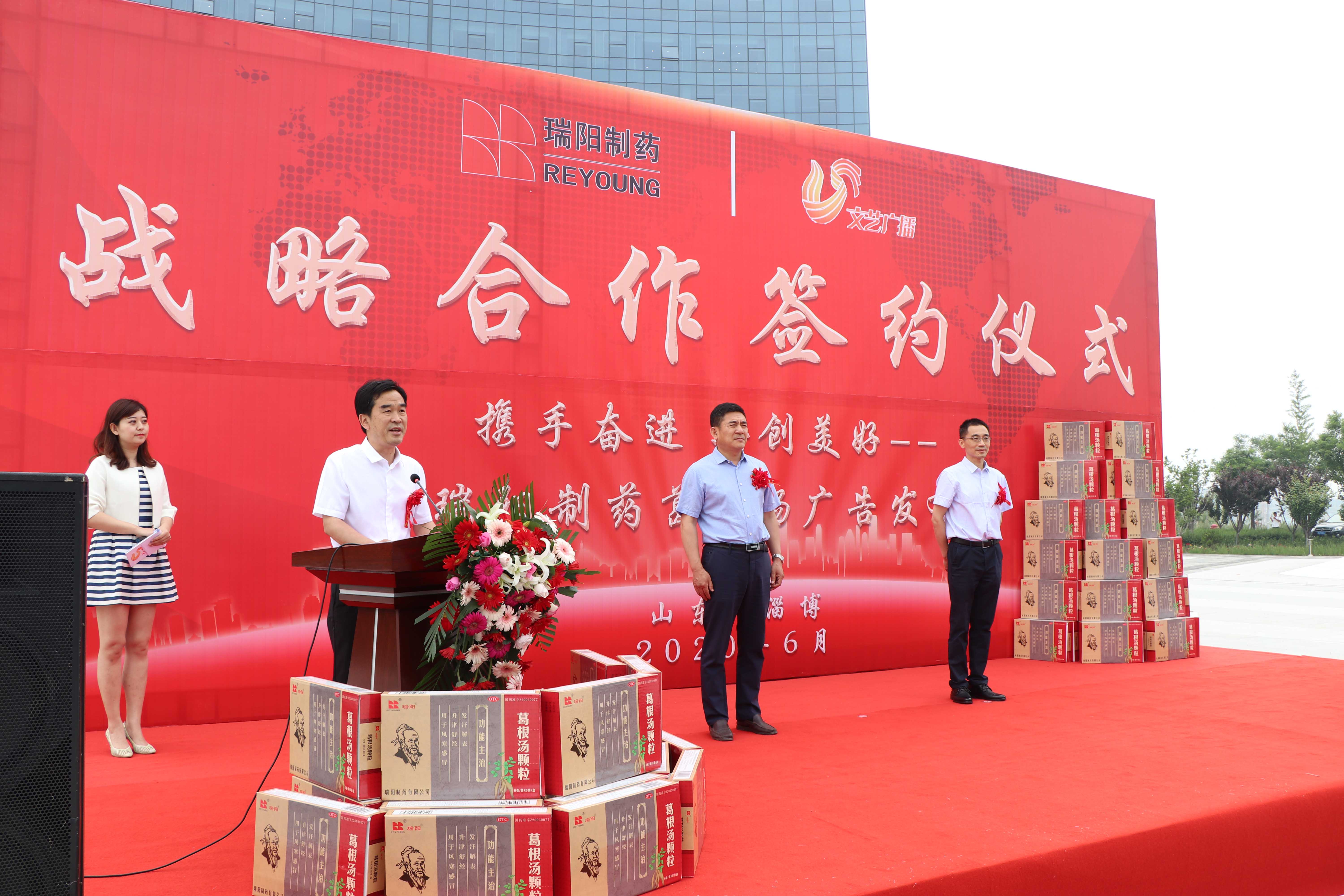 近日,公司與山東文藝廣播頻道戰略合作暨瑞陽產品“葛根湯顆?!本€上發布啟動儀式舉行。山東廣播電視臺文藝廣播頻道總監孫彥杰,公司董事長、總裁苗得足,副總裁楊立峰參加了啟動儀式。本次活動通過山東文藝廣播、山東交通廣播、山東廣播電視臺官方音視頻直播平臺“51聽”APP同步進行了音視頻直播。